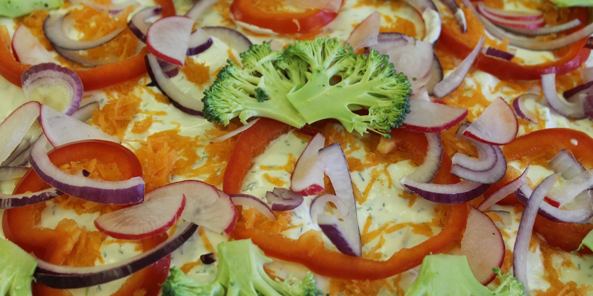 - If you’re going to eat the veggies raw allow your pizza base to cool then spread the creamed mixture on top and add the onion, carrot, broccoli, radish and peppers. Cover and chill. Once chilled cut into squares and serve.